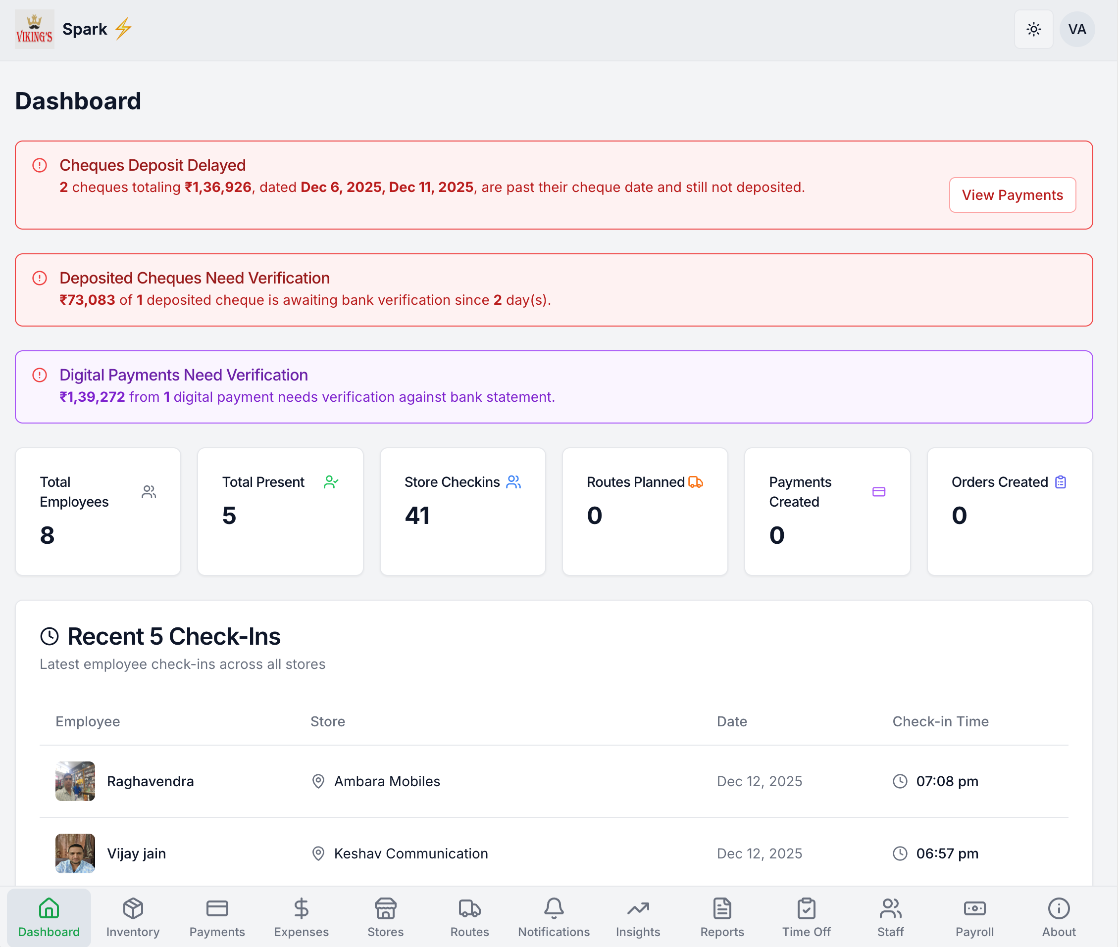 Comprehensive analytics with store coverage, visit trends, payment analytics, expense reporting, and sales insights across time periods.